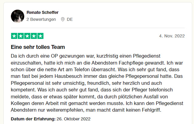 Die Fachpflege Abendstern GmbH zeichnet sich durch Kompetenz, Zuverlässigkeit und einen einfühlsamen Umgang aus.