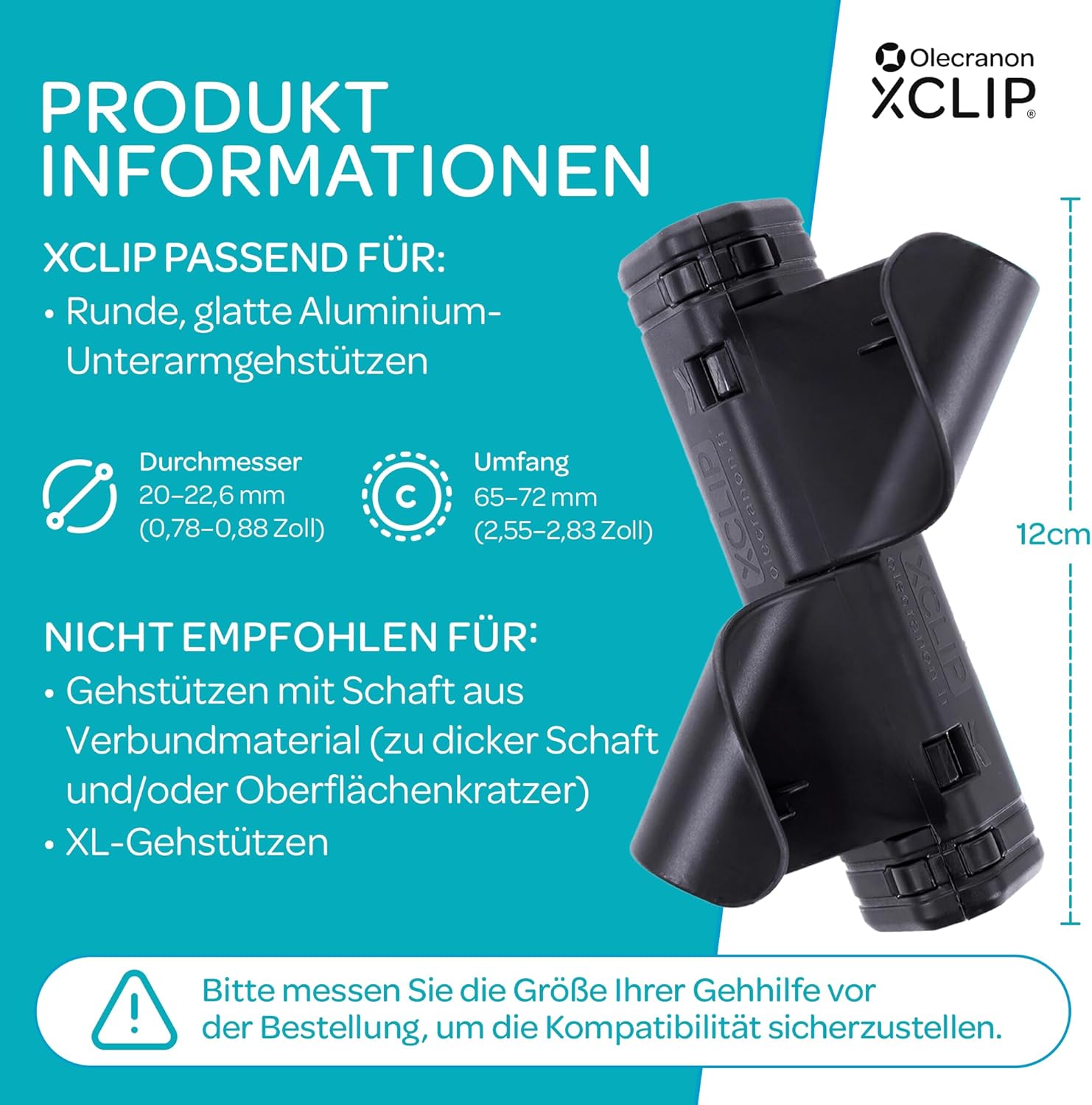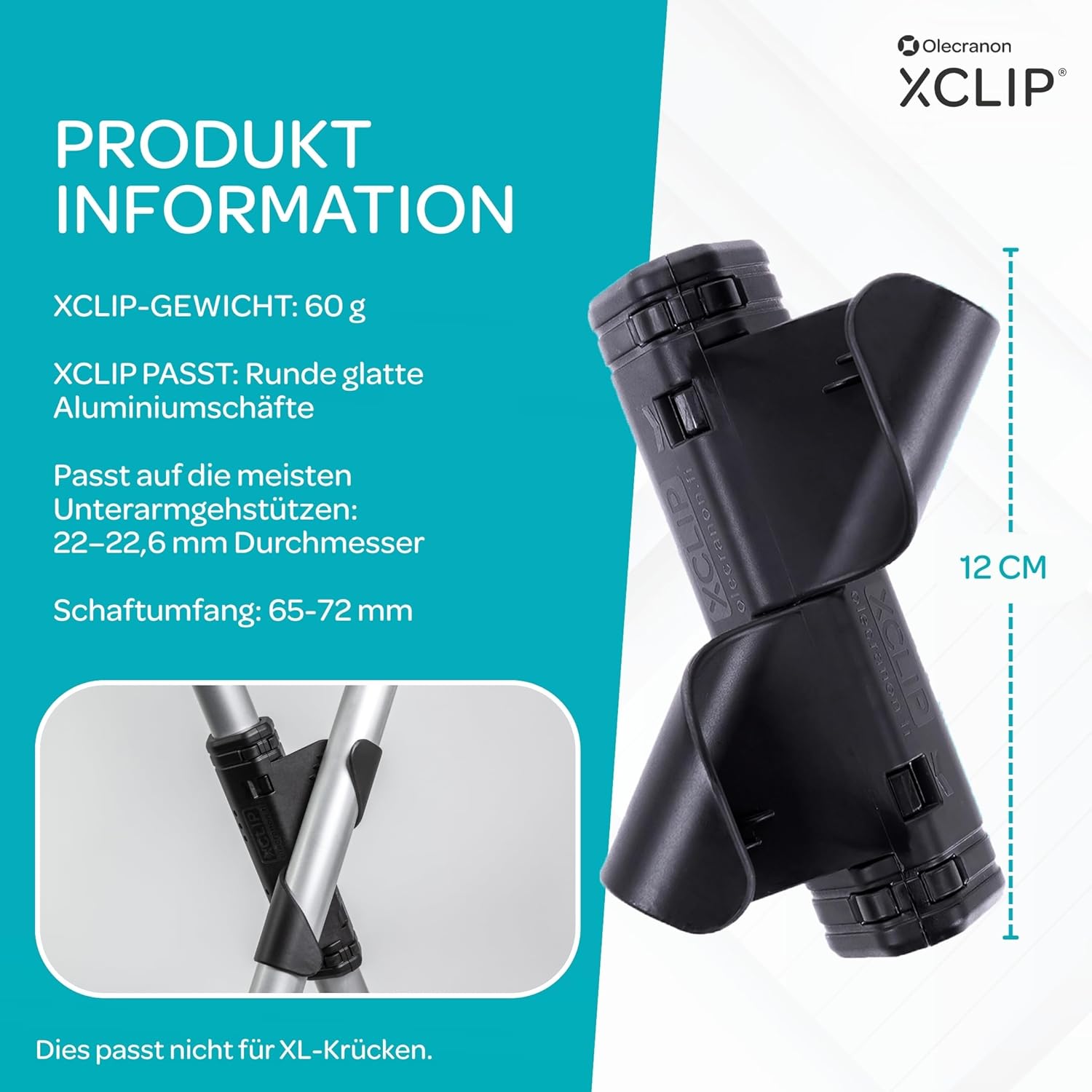 Bitte beachten Sie, dass der XCLIP speziell für runde, glatte Aluminium-Unterarmgehstützen entwickelt wurde. Er ist passend für einen Schaftdurchmesser von 20 bis 22,6 mm (entspricht einem Umfang von 64 bis 72 mm). Er ist nicht für ovale oder ergonomisch geformte Spezialkrücken geeignet.