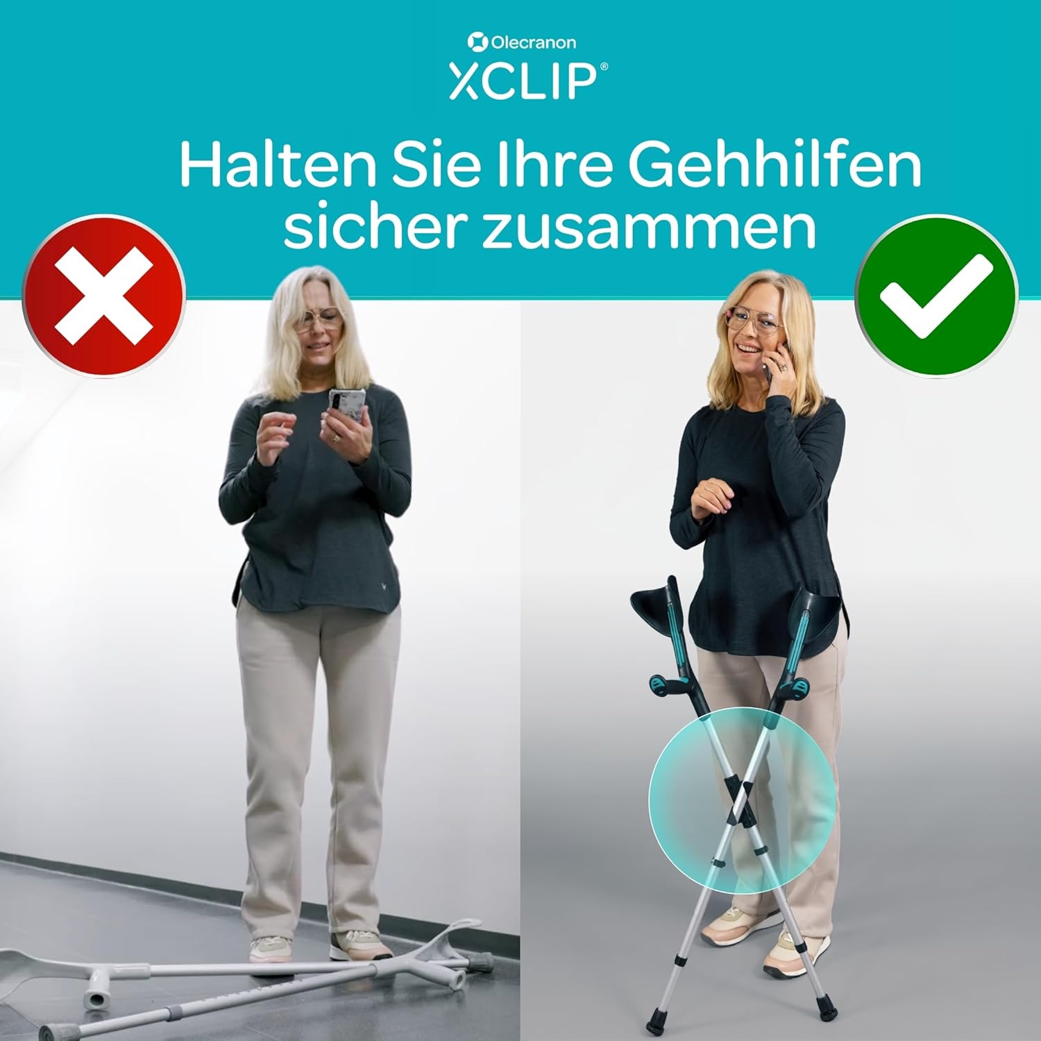 Der XCLIP nutzt ein cleveres, X-förmiges Design, mit dem Sie Ihre beiden Krücken im Handumdrehen stabil miteinander verbinden können. Sobald die Gehhilfen ineinander fixiert sind, bilden sie eine breitere, standfeste Basis. Sie können die Krücken nun sicher an Wände, Tische oder Stühle lehnen, ohne dass diese wegrutschen. Selbst das freie Stehen der Krücken aneinander gelehnt wird deutlich stabiler.