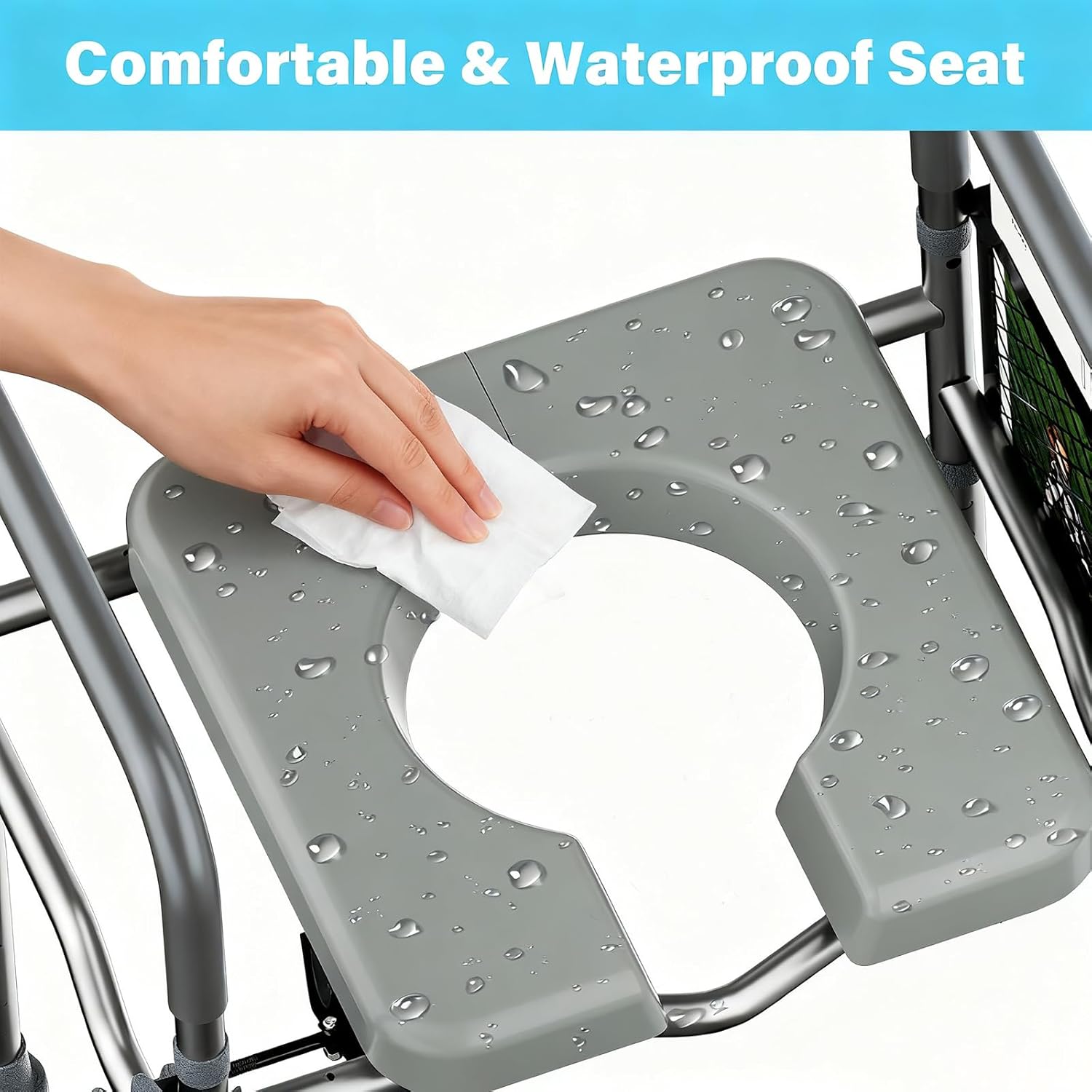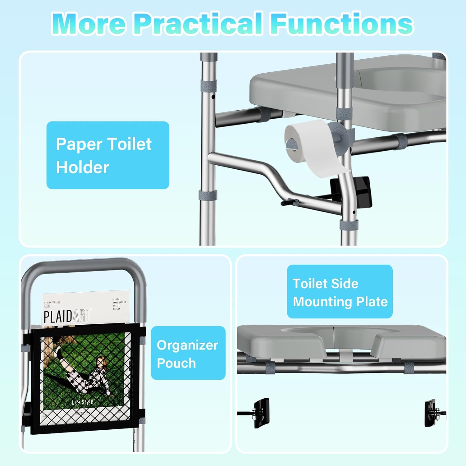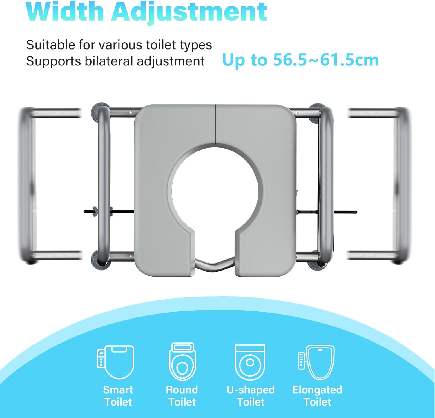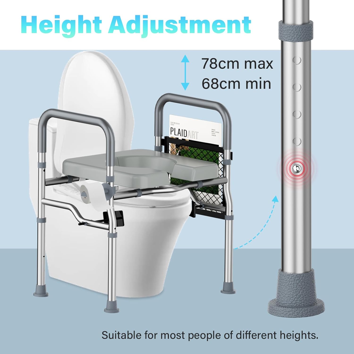 Das Hinsetzen und Aufstehen belastet oft Knie und Hüften. Die gepolsterten Armlehnen bieten hier die nötige Unterstützung. Sie sind mit einem weichen, wasserabweisenden Schaumstoff überzogen, der nicht nur angenehm griffig ist, sondern auch zusätzliche Sturzprävention bietet. Ein besonderes Merkmal ist das männerfreundliche Design: Die vordere Querstange wurde um 25° geneigt, um maximale Barrierefreiheit und eine einfachere Intimhygiene für alle Geschlechter zu gewährleisten.